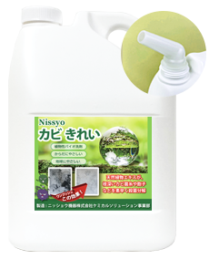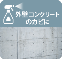 | 用途 | 建物の室内・屋外のコンクリート、石材、モルタル、塗装壁などのカビ・藻類・汚れの殺菌除去 水回り、浴室などのカビ殺菌・汚れ除去 ゴミステーションなどカビが定常的に発生しやすい場所の殺菌 |